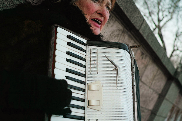 On the streets of Riga, the capital of Latvia, she was strumming her accordion and singing loudly in a hoarse voice.
