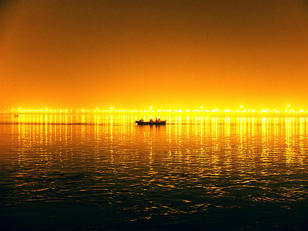 The illumination of Hindu communities on the other side of the river was reflected on the surface of the Ganges.